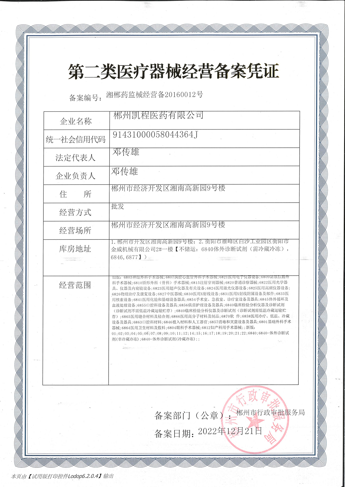 第二類醫(yī)療器械經(jīng)營(yíng)備案憑證:湘郴藥監(jiān)械經(jīng)營(yíng)備20160012號(hào)